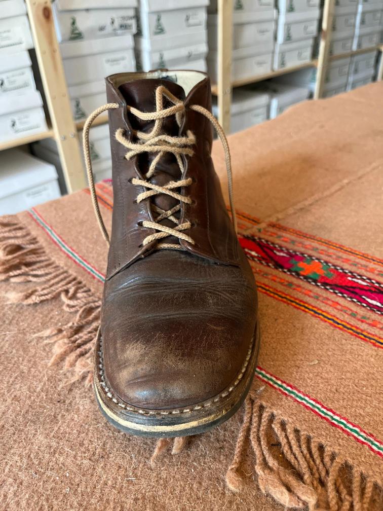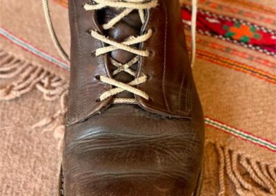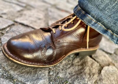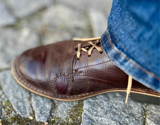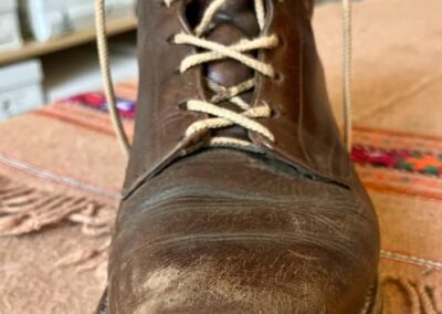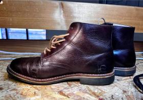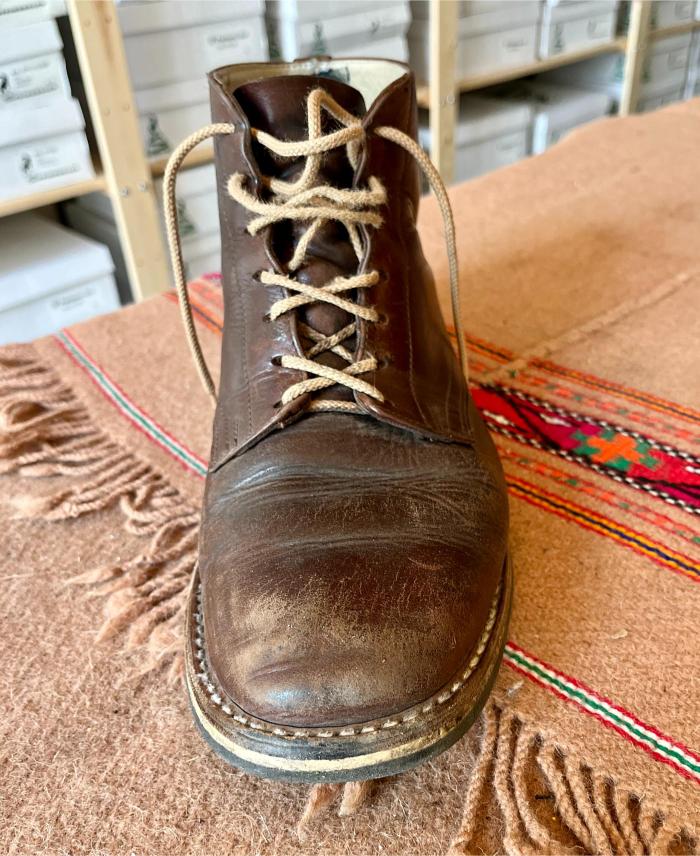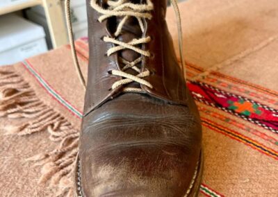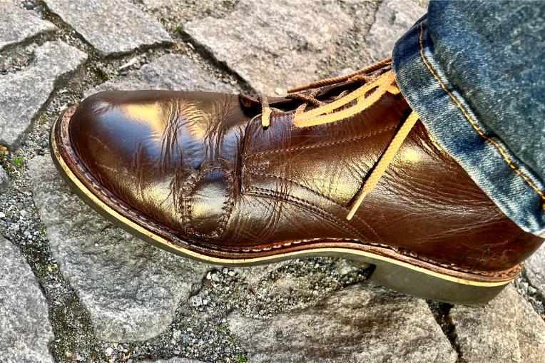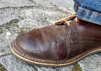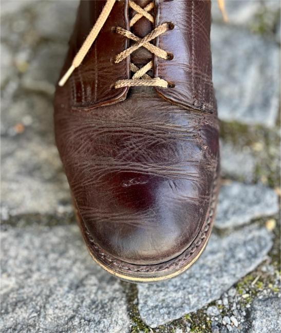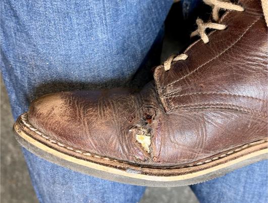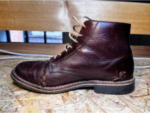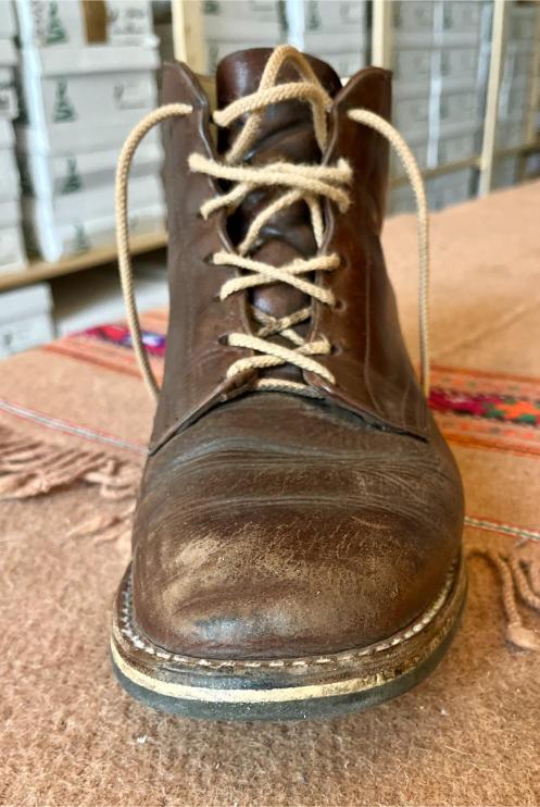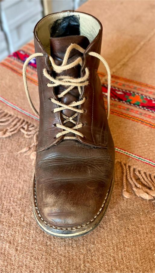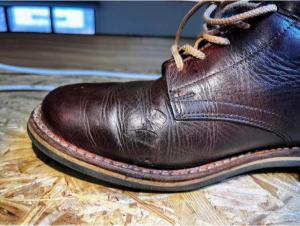 Toto jsou moje vlastní boty Retro, které nosím každý den do práce, v dílně, na procházky s dcerou za pěkného počasí v lese. No moje nejpoužívanější boty. Jednou, na dílně jsem potřeboval vyměnit nože na frézce a tentokrát jsem výjimečně nevytáhl kabel z elektřiny. No a stalo se, že frézka spadla na zem, zapla se, začala kolem sebe dělat paseku. Chytla i moje nohy, ale naštěstí je boty ochránily, ale samy dostaly pořádně do těla. Toto je lekce, kterou si připomínám vždy, když pracuji s elektrickým nářadím, nebo se kouknu na své boty.