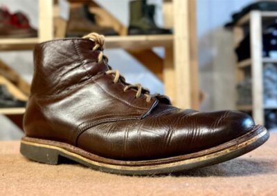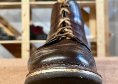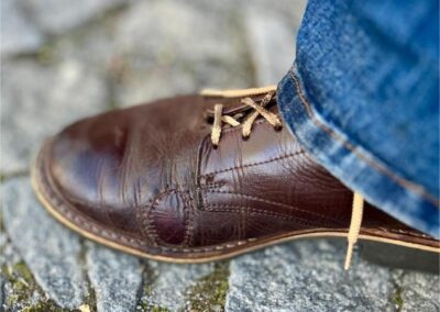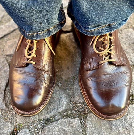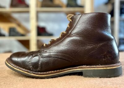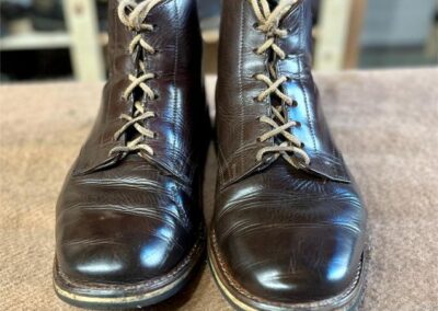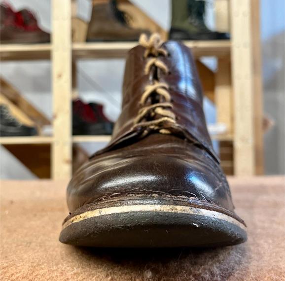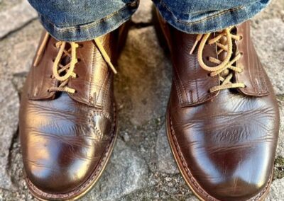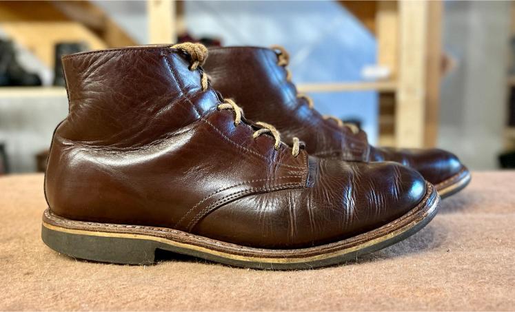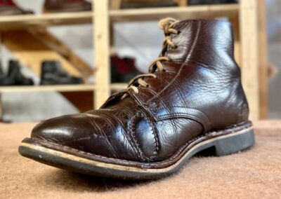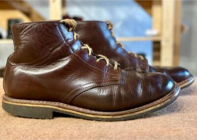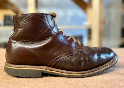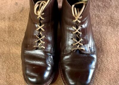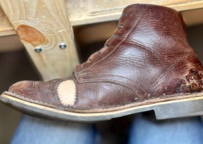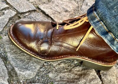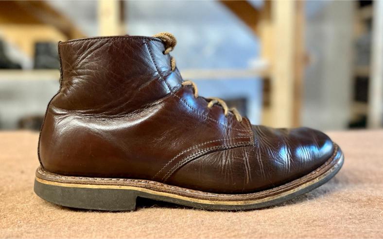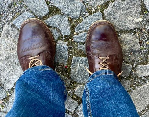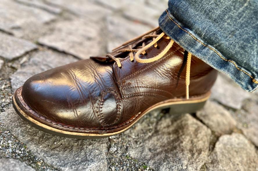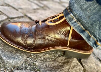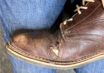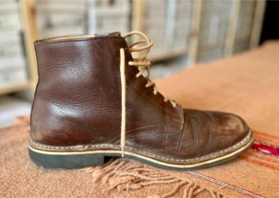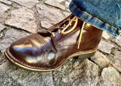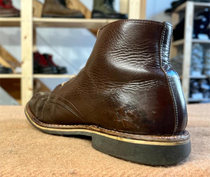 Toto jsou moje vlastní boty Retro, které nosím každý den do práce, v dílně, na procházky s dcerou za pěkného počasí v lese. No moje nejpoužívanější boty. Jednou, na dílně jsem potřeboval vyměnit nože na frézce a tentokrát jsem výjimečně nevytáhl kabel z elektřiny. No a stalo se, že frézka spadla na zem, zapla se, začala kolem sebe dělat paseku. Chytla i moje nohy, ale naštěstí je boty ochránily, ale samy dostaly pořádně do těla. Toto je lekce, kterou si připomínám vždy, když pracuji s elektrickým nářadím, nebo se kouknu na své boty.