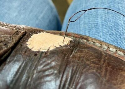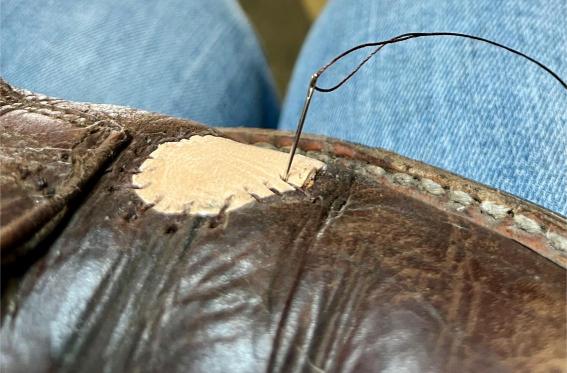 Mezi svršek a podšívku jsem vlepil tenkou kůži a v místě díry jsem nalepil koženou záplatu, aby seděla a byla v stejné tloušťce jako svršek. Přilepit a pěkně sešít ručně sedlářským stehem.