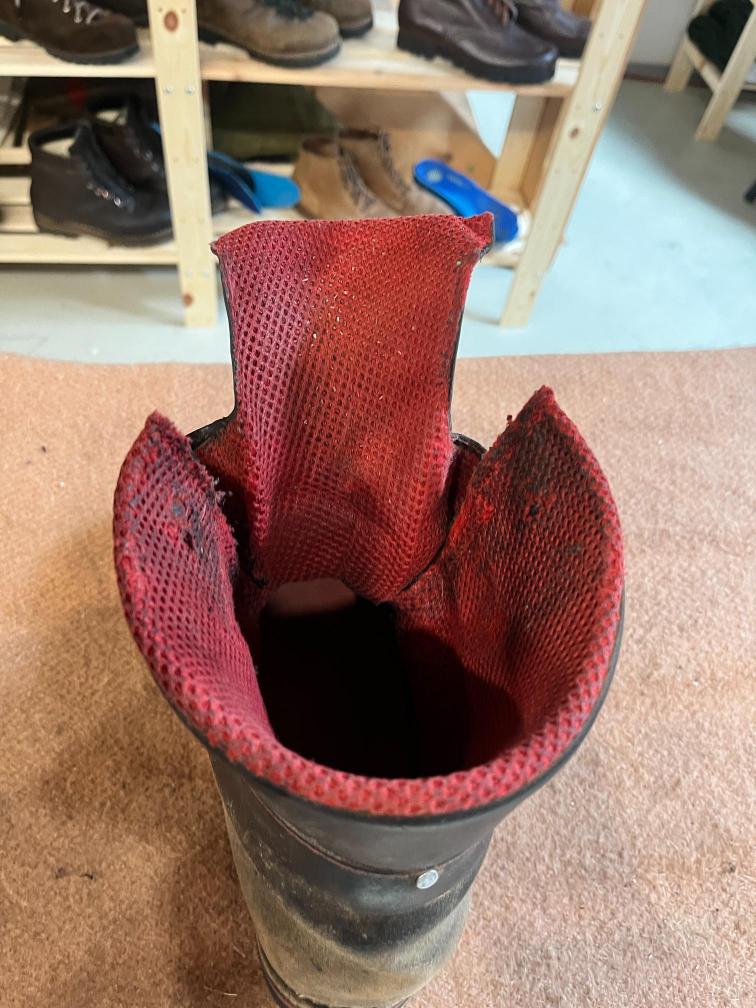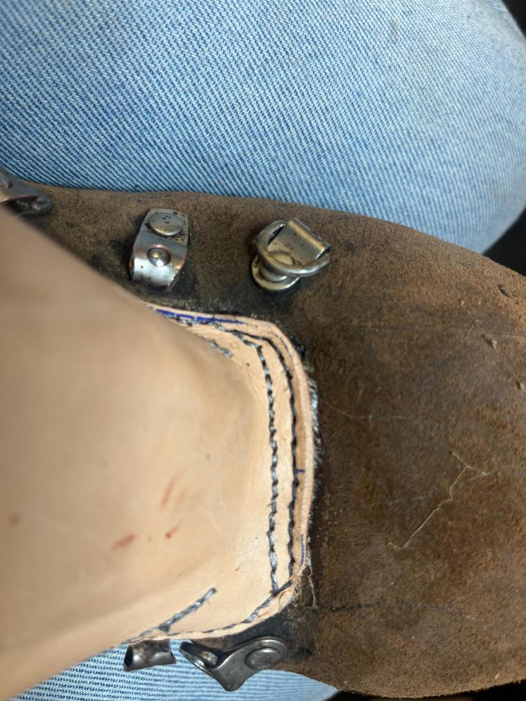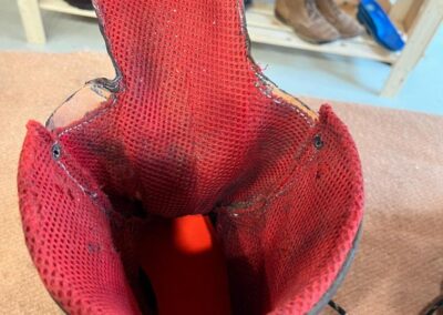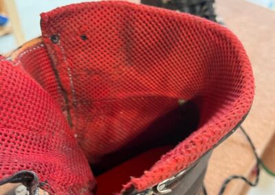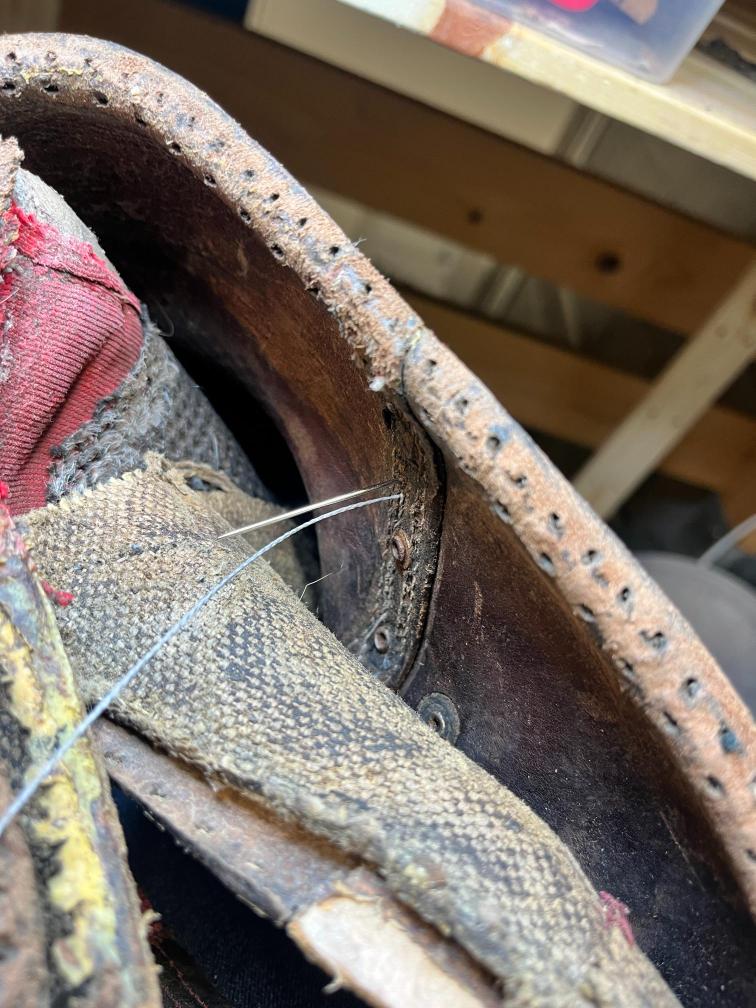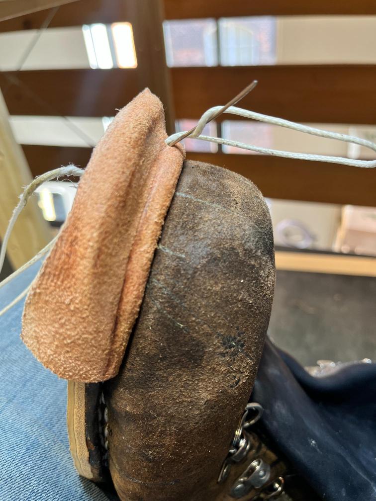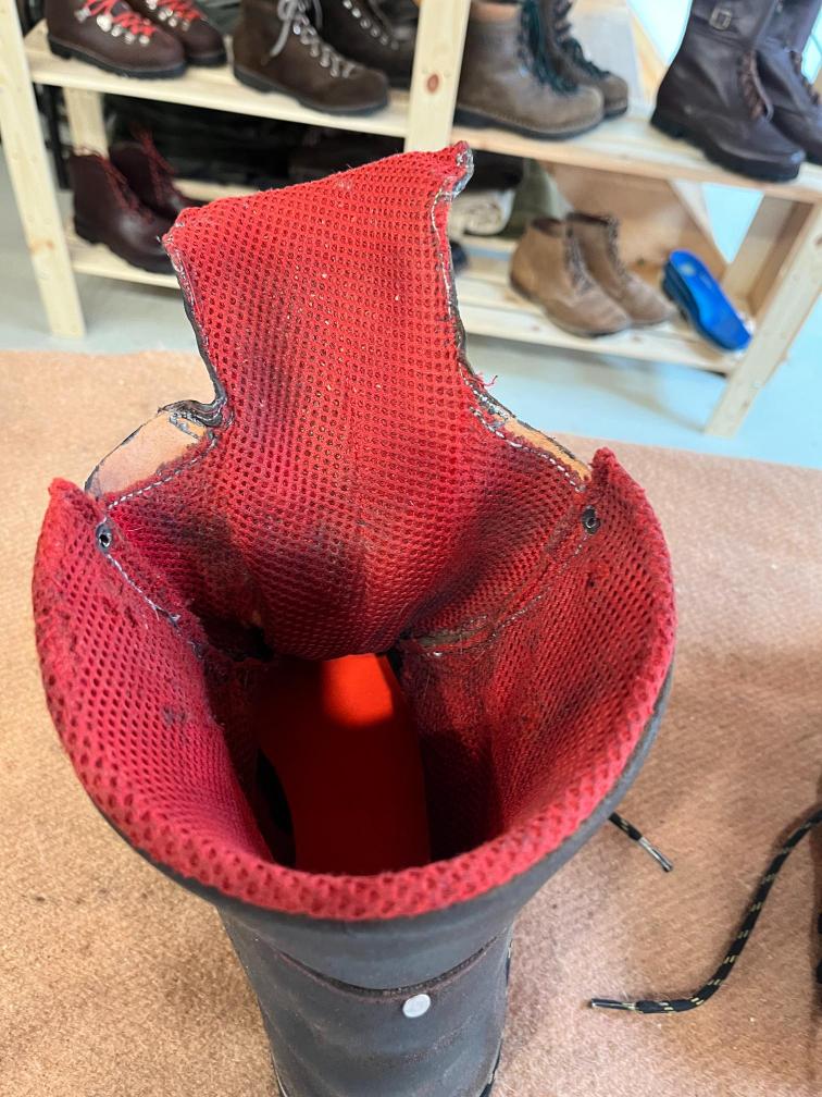 Jazyk jsem dával nový, zachoval jsem jen vrchní část, podšívku a bezpečností výplně kvůli neprořezu. I když jsem hodně šil na šicím stroji, některé stehy jsem musel dělat ručně sedlářským stehem. V dolní části jazyku jsem přidal jeden steh navíc, na rozdíl od originálu, aby lépe těsnil. Všechno šití i to strojem, je nití Dyneema, to už se jen tak neroztrhá 🙂