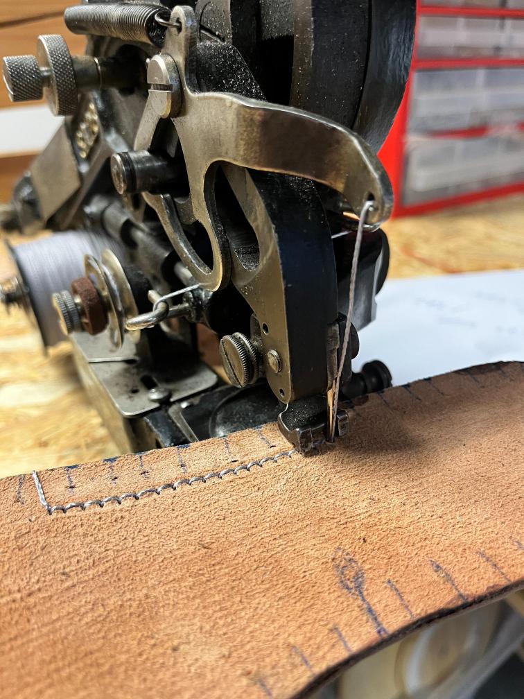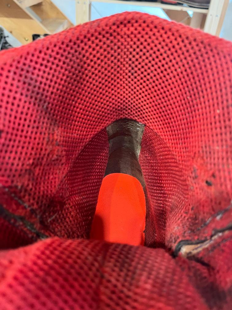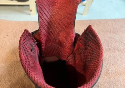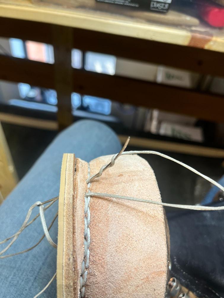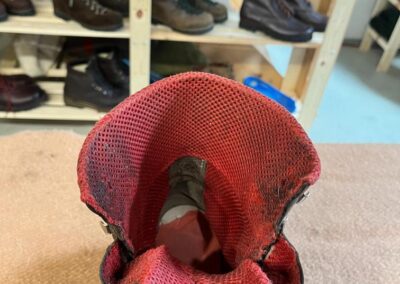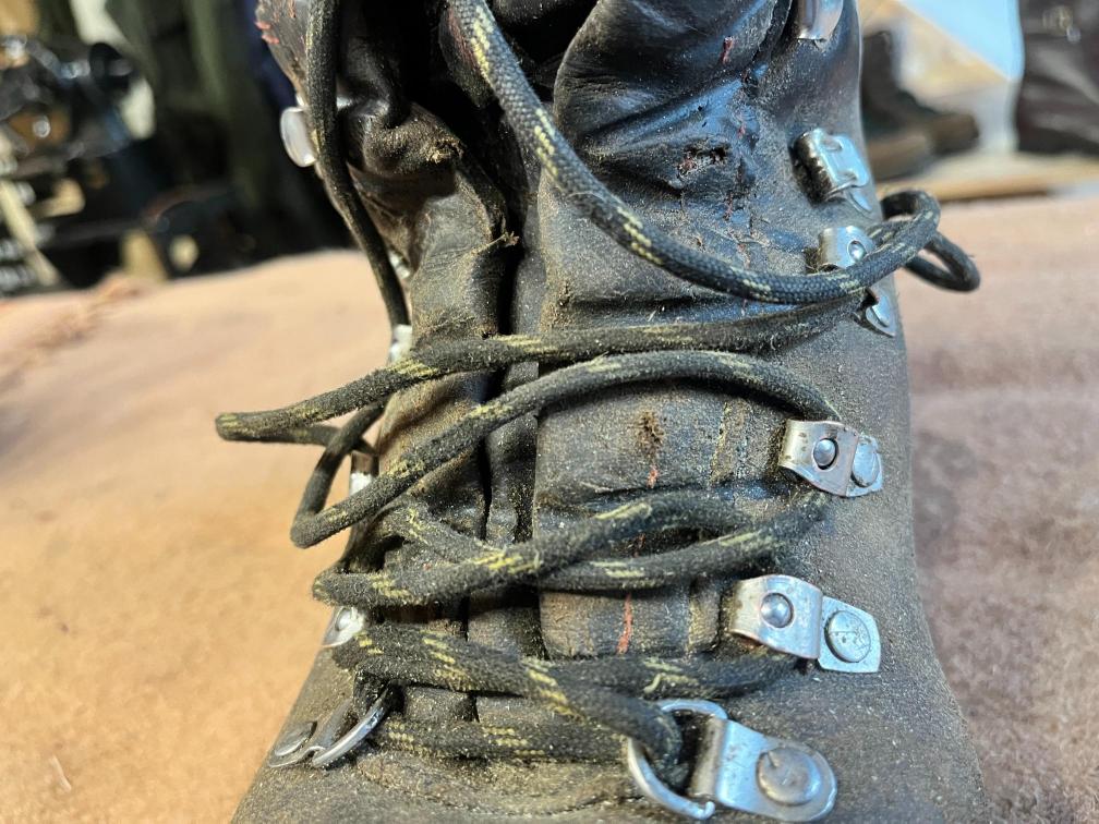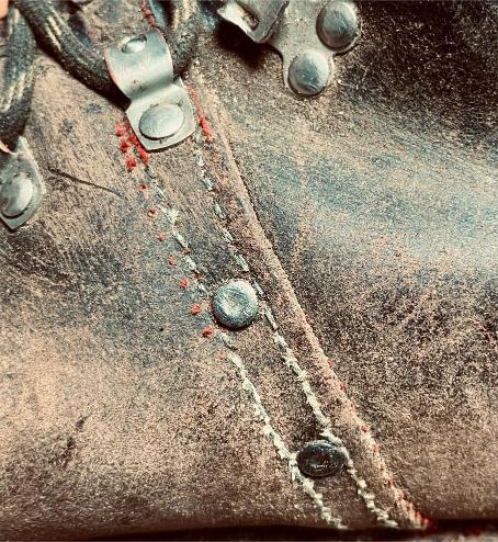 Jazyk jsem dával nový, zachoval jsem jen vrchní část, podšívku a bezpečností výplně kvůli neprořezu. I když jsem hodně šil na šicím stroji, některé stehy jsem musel dělat ručně sedlářským stehem. V dolní části jazyku jsem přidal jeden steh navíc, na rozdíl od originálu, aby lépe těsnil. Všechno šití i to strojem, je nití Dyneema, to už se jen tak neroztrhá 🙂