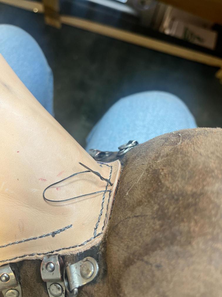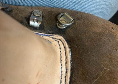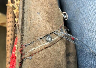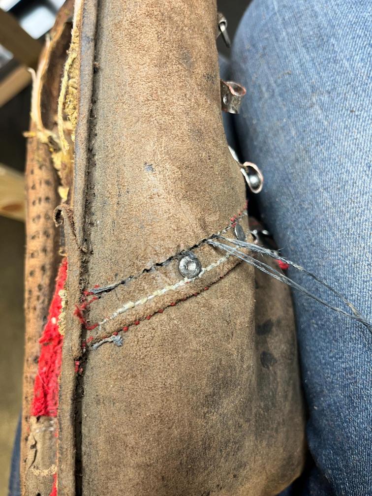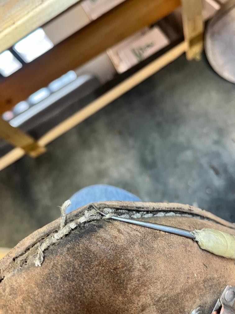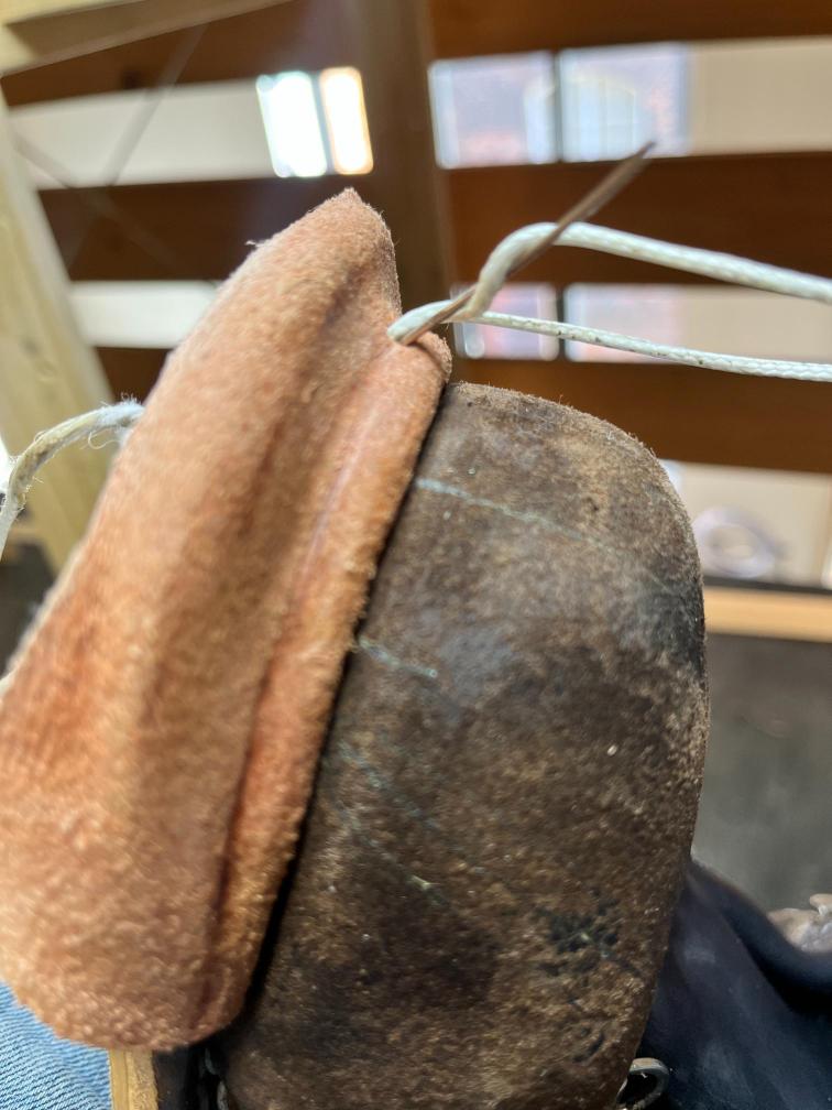 • oprava poškozeného šití pomocí nitě z Dyneema a to ručně sedlářským stehem, do původních dírek po starém šití,