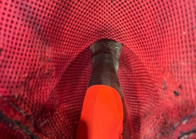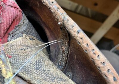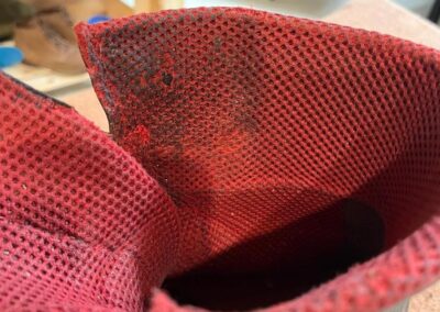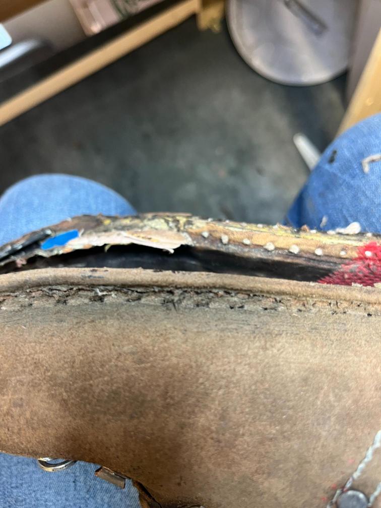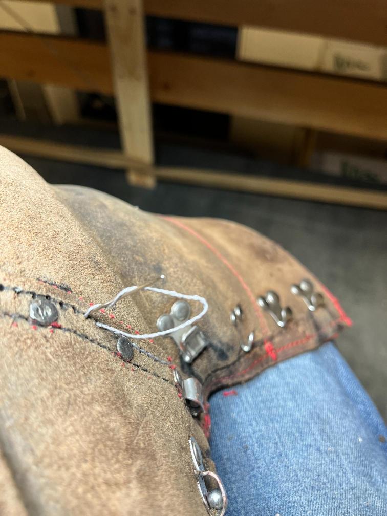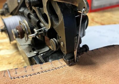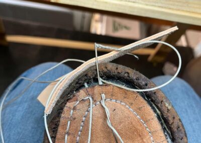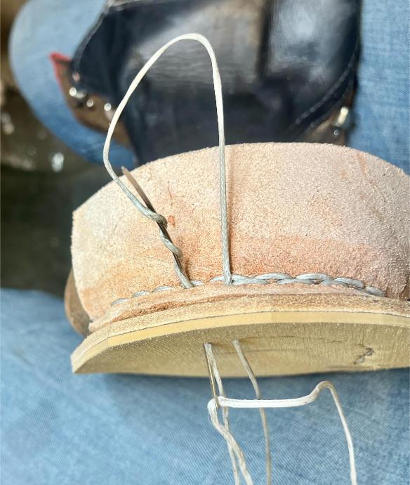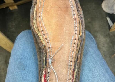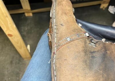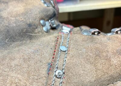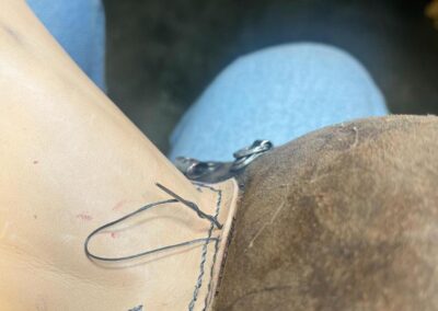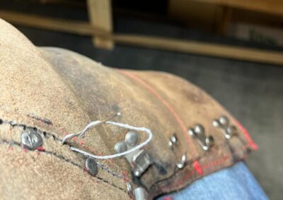 • oprava poškozeného šití pomocí nitě z Dyneema a to ručně sedlářským stehem, do původních dírek po starém šití,