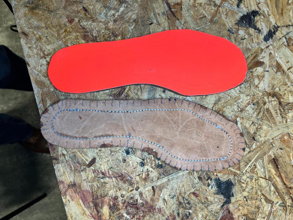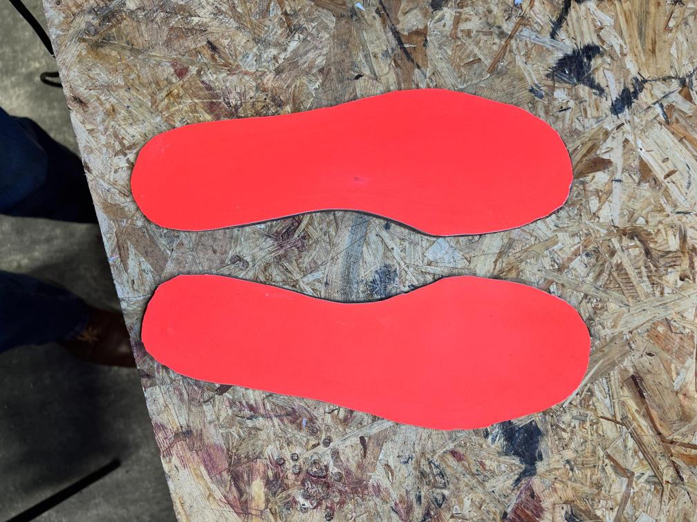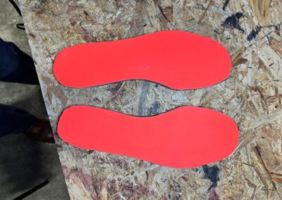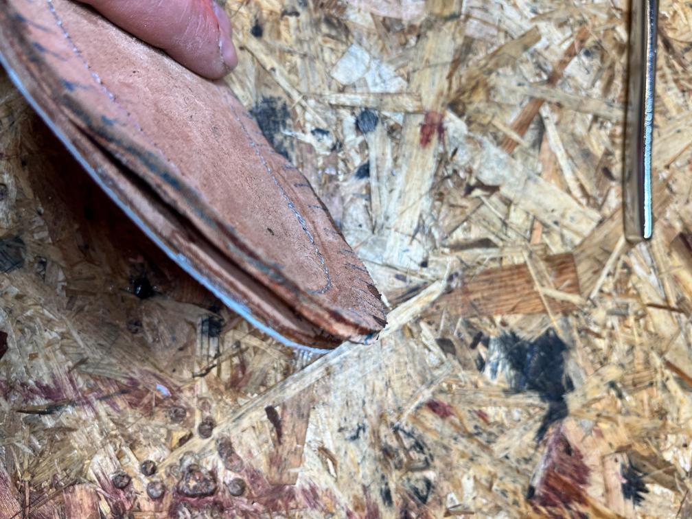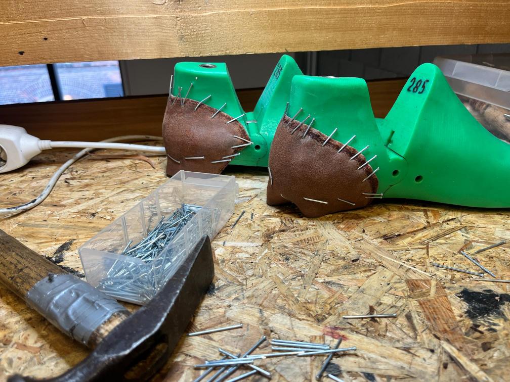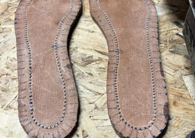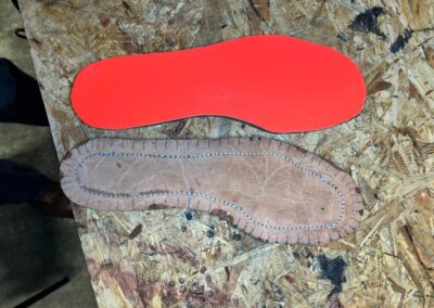 Nová napínací stélka, Která se skládá ze 3 částí a to z důvodu ocelové špičky. Musel jsem improvizovat, ale bude to držet lépe, než původní stélka, Celé jsem to přešil nití Dyneema. Ta oranžová kůže je klokaní 🙂