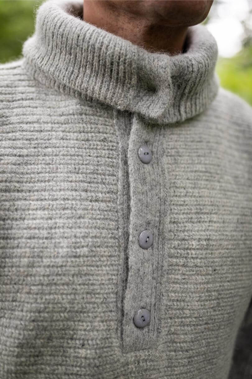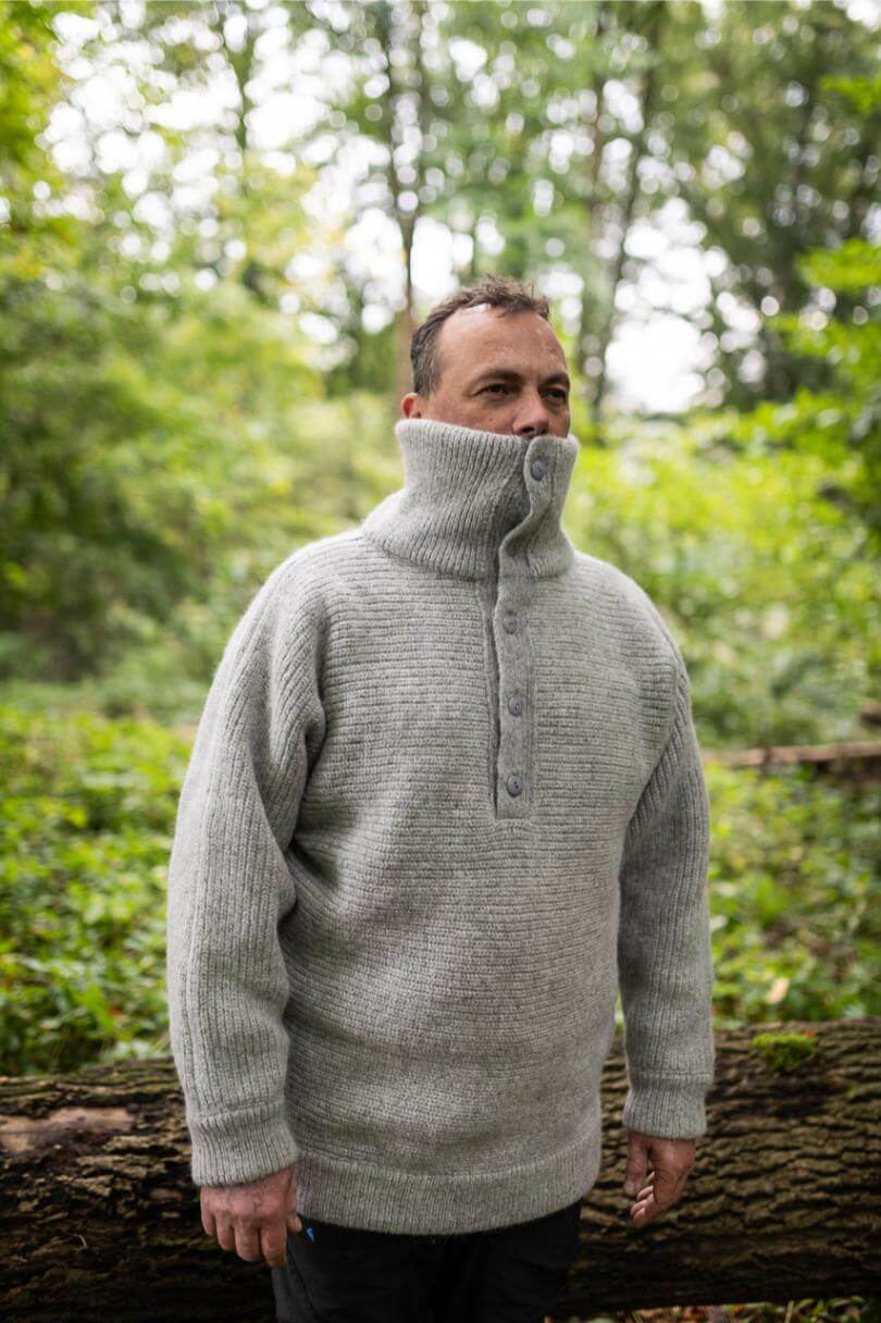 Límec, který je skoro jako kapuce. Pokud dopnete i poslední knoflík, budou vám vykukovat jen oči, uši a nos. Přidejte čepici (ideálně také těžkou vlněnou) a jste uzamčeni před živly. Tento svetr nepotřebuje k sobě nákrčník nebo šálu (snad jen na prodloužené bivaky na místě).